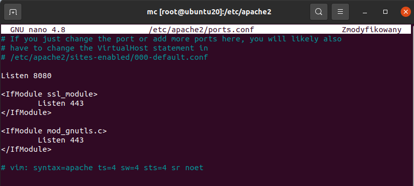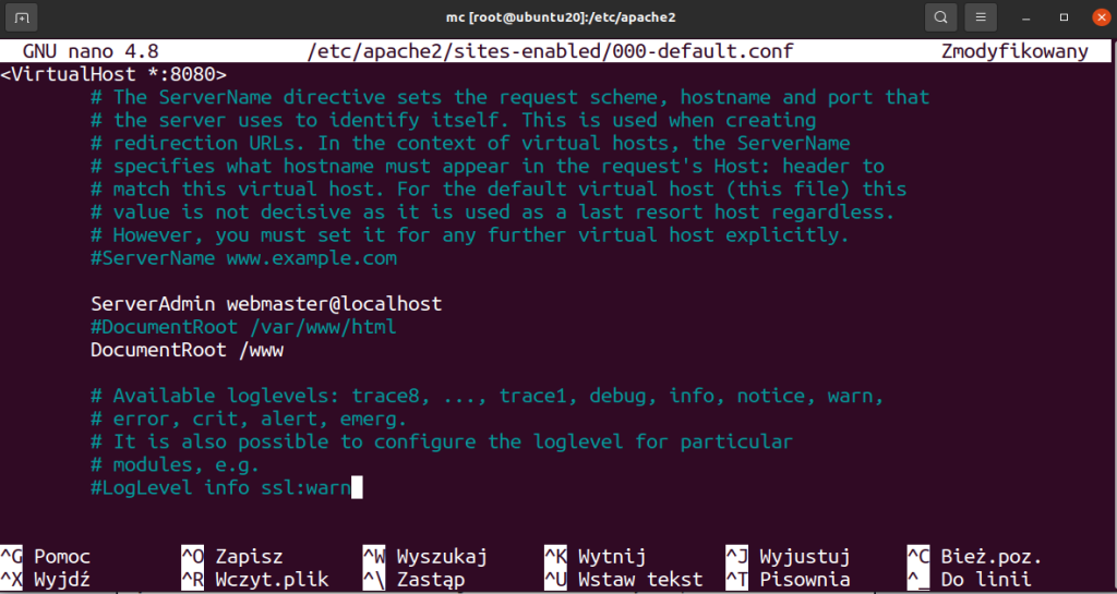 Konfigurujemy pliki Apache2 dodając lokalizację naszej strony, zmieniamy port, na którym nasłuchuje server na 8080.