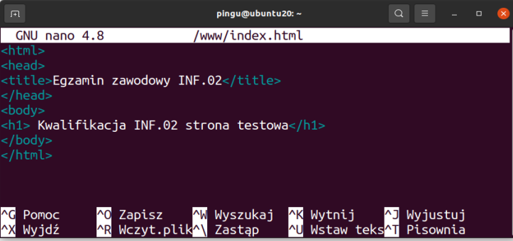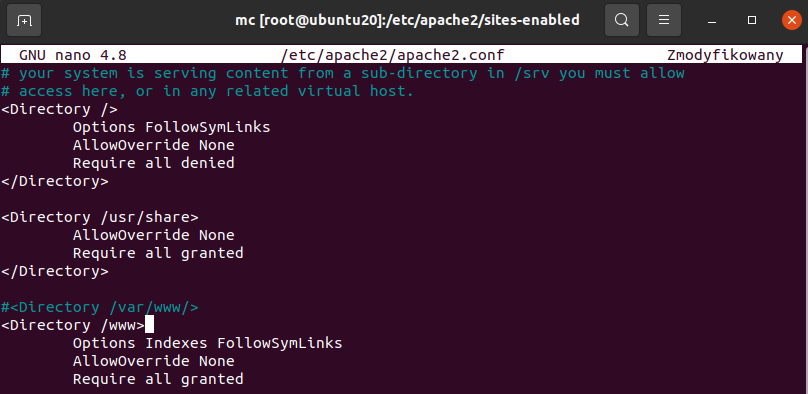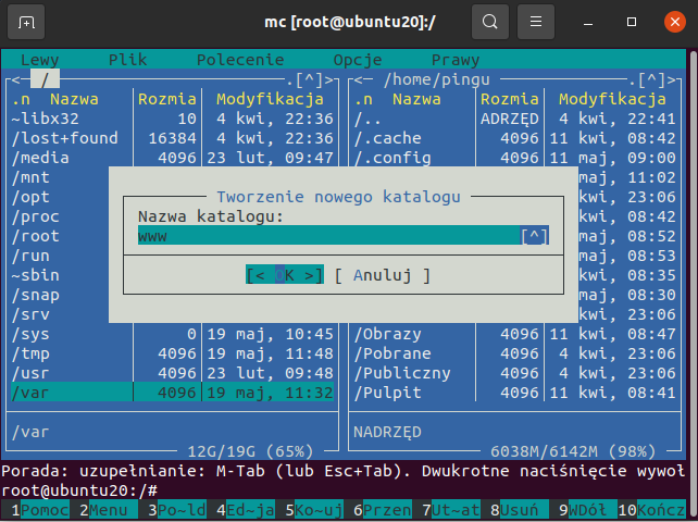 Tworzymy nowy folder /www, w którym umieścimy plik naszej strony testowej /www/index.html. Możemy skorzystać z Midnight Commandera, który uruchamiamy z uprawnieniami administratora.